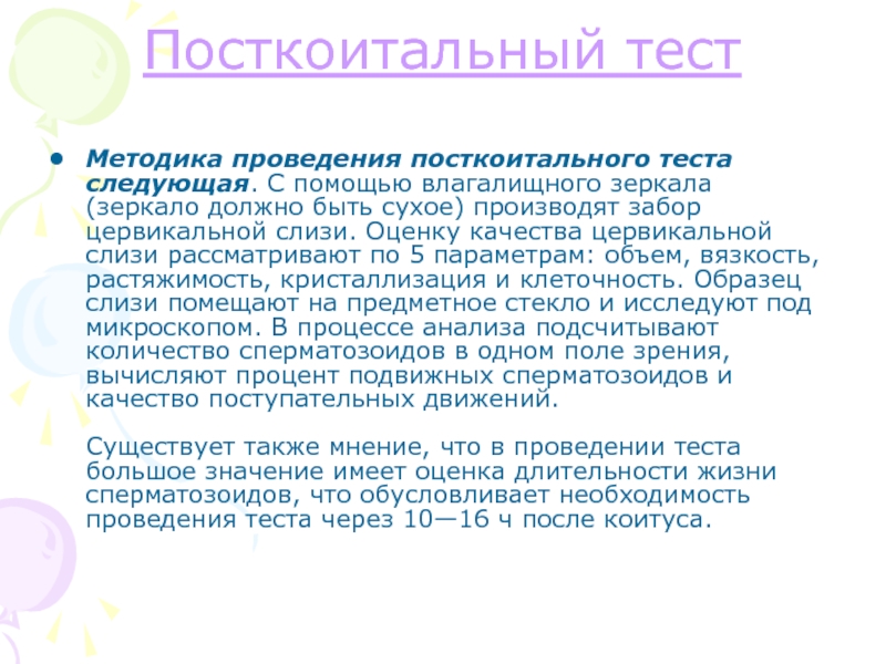 Существует также мнение, что в проведении теста большое значение имеет оценка длительности жизни сперматозоидов, что обусловливает необходимость проведения теста через 10—16 ч после коитуса.