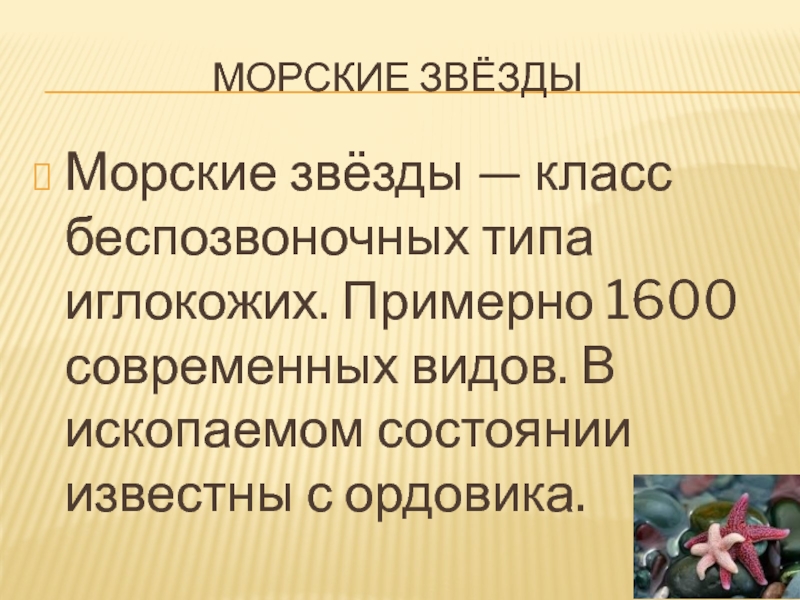 Морские звёзды — класс беспозвоночных типа иглокожих. Примерно 1600 современных видов. В ископаемом состоянии известны с ордовика.