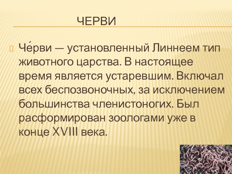 Че́рви — установленный Линнеем тип животного царства. В настоящее время является устаревшим. Включал всех беспозвоночных, за исключением большинства членистоногих. Был расформирован зоологами уже в конце XVIII века.