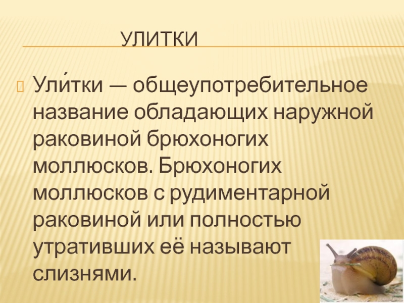 Ули́тки — общеупотребительное название обладающих наружной раковиной брюхоногих моллюсков. Брюхоногих моллюсков с рудиментарной раковиной или полностью утративших её называют слизнями.