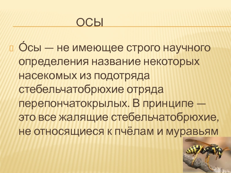 О́сы — не имеющее строго научного определения название некоторых насекомых из подотряда стебельчатобрюхие отряда перепончатокрылых. В принципе — это все жалящие стебельчатобрюхие, не относящиеся к пчёлам и муравьям