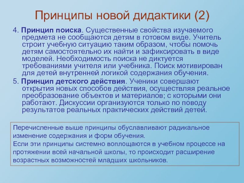 Перечисленные выше принципы обуславливают радикальное изменение содержания и форм обучения.