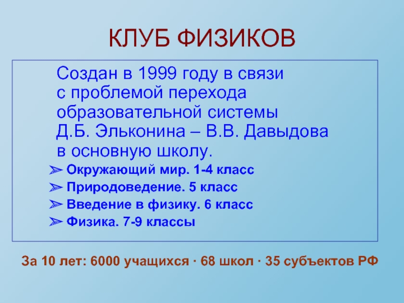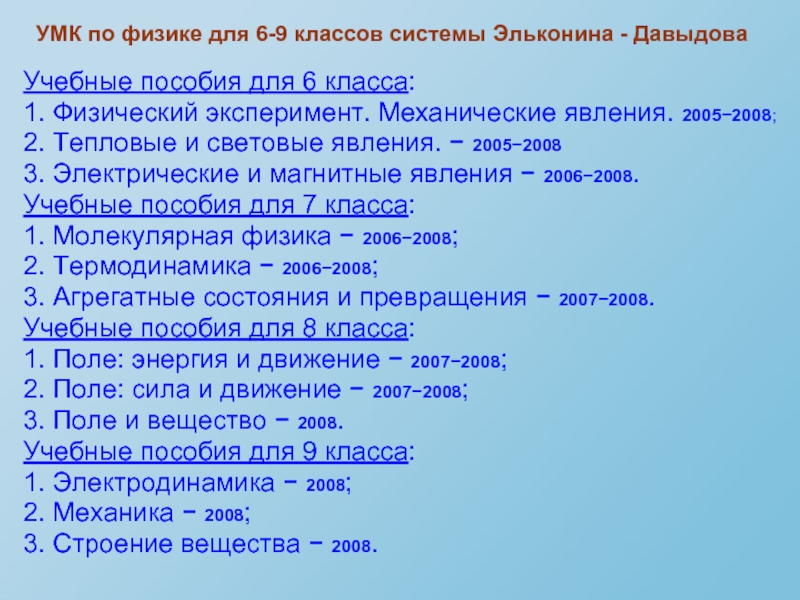 Оформление УМК по физике для системы Д.Б. Эльконина – В.В. Давыдова (программа, методическое пособие, рабочая тетрадь для 6 класса, учебные пособия для 7-8 классов, справочное руководство для 9 класса, сборник задач и упражнений для 7-9 классов, диск с цифровыми ресурсами, сайт поддержки курса физики)