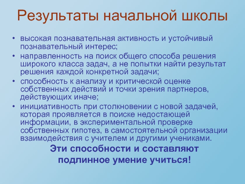 Слайд 25высокая познавательная активность и устойчивый познавательный интерес;