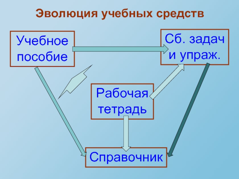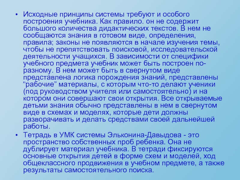 не содержит большого количества дидактических текстов. В нем не сообщаются знания в готовом виде, определения, правила; законы не появляются в начале изучения темы, чтобы не препятствовать поисковой, исследовательской деятельности учащихся. В зависимости от специфики учебного предмета учебник может быть построен по-разному. В нем может быть в свернутом виде представлена логика порождения знаний, представлены “рабочие” материалы, с которым что-то делают ученики (под руководством учителя или самостоятельно) и на котором они совершают свои открытия. Все открываемые детьми знания обычно представлены в нем в свернутом виде в схемах и моделях, которые дети должны разворачивать и делать средствами своей дальнейшей работы.