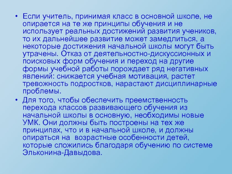 же принципы обучения и не использует реальных достижений развития учеников, то их дальнейшее развитие может замедлиться, а некоторые достижения начальной школы могут быть утрачены. Отказ от деятельностно-дискуссионных и поисковых форм обучения и переход на другие формы учебной работы порождает ряд негативных явлений: снижается учебная мотивация, растет тревожность подростков, нарастают дисциплинарные проблемы.