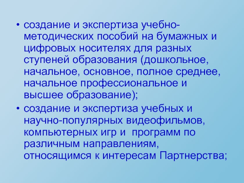 создание и экспертиза учебных и научно-популярных видеофильмов, компьютерных игр и программ по различным направлениям, относящимся к интересам Партнерства;