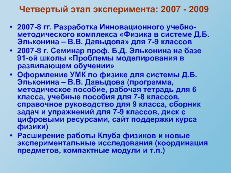 Слайд 392007-8 гг. Разработка Инновационного учебно-методического комплекса «Физика в системе Д.Б. Эльконина
