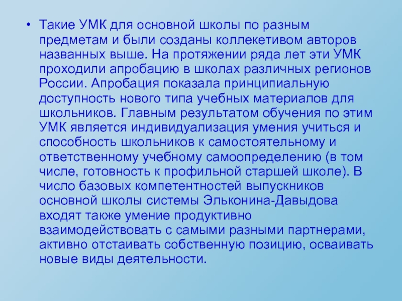 коллекетивом авторов названных выше. На протяжении ряда лет эти УМК проходили апробацию в школах различных регионов России. Апробация показала принципиальную доступность нового типа учебных материалов для школьников. Главным результатом обучения по этим УМК является индивидуализация умения учиться и способность школьников к самостоятельному и ответственному учебному самоопределению (в том числе, готовность к профильной старшей школе). В число базовых компетентностей выпускников основной школы системы Эльконина-Давыдова входят также умение продуктивно взаимодействовать с самыми разными партнерами, активно отстаивать собственную позицию, осваивать новые виды деятельности.
