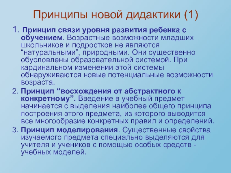 2. Принцип “восхождения от абстрактного к конкретному”. Введение в учебный предмет начинается с выделения наиболее общего принципа построения этого предмета, из которого выводится все многообразие конкретных правил и определений.