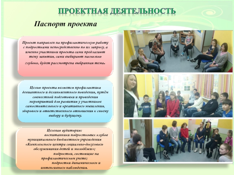 Целью проекта является профилактика девиантного и делинквентного поведения, путём совместной подготовки и проведения мероприятий для развития у участников самостоятельного и креативного мышления, здорового и ответственного отношения к своему выбору и будущему.