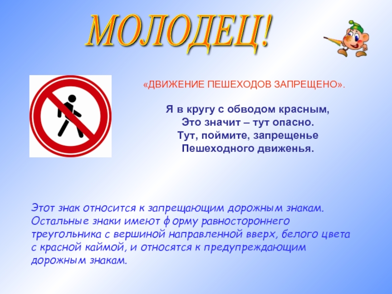 Этот знак относится к запрещающим дорожным знакам. Остальные знаки имеют форму равностороннего треугольника с вершиной направленной вверх, белого цвета с красной каймой, и относятся к предупреждающим дорожным знакам.