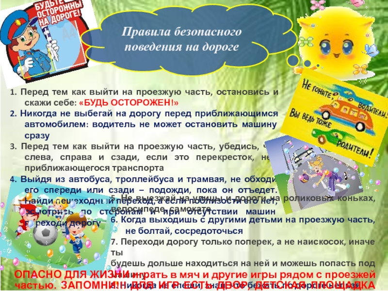 ОПАСНО ДЛЯ ЖИЗНИ играть в мяч и другие игры рядом с проезжей частью. ЗАПОМНИ!!! ДЛЯ ИГР ЕСТЬ ДВОР, ДЕТСКАЯ ПЛОЩАДКА или СТАДИОН!!!
