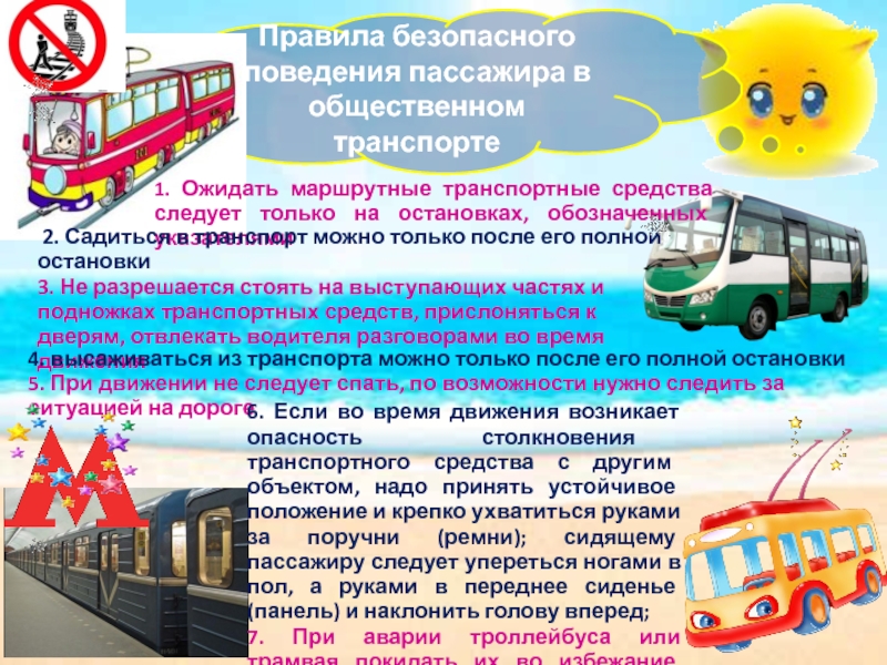 3. Не разрешается стоять на выступающих частях и подножках транспортных средств, прислоняться к дверям, отвлекать водителя разговорами во время движения