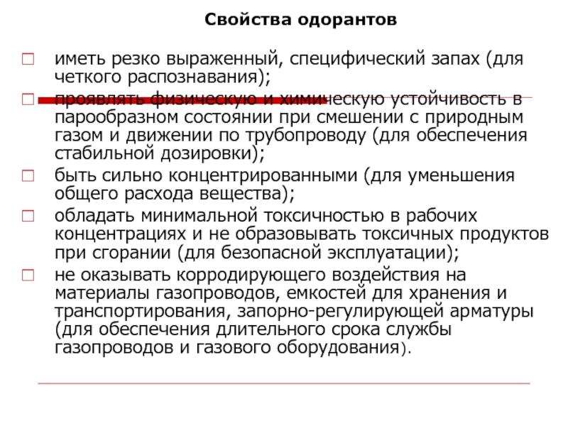не оказывать корродирующего воздействия на материалы газопроводов, емкостей для хранения и транспортирования, запорно-регулирующей арматуры (для обеспечения длительного срока службы газопроводов и газового оборудования).
