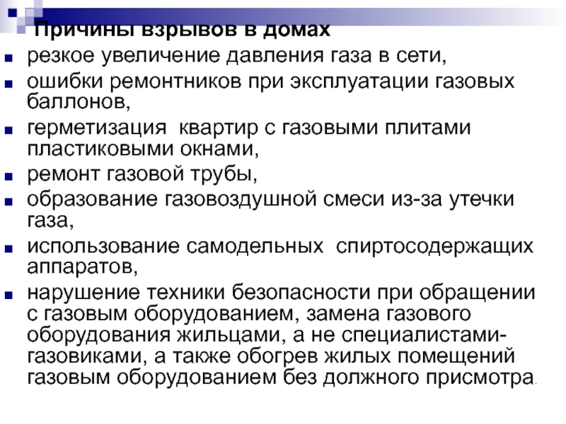 нарушение техники безопасности при обращении с газовым оборудованием, замена газового оборудования жильцами, а не специалистами-газовиками, а также обогрев жилых помещений газовым оборудованием без должного присмотра.