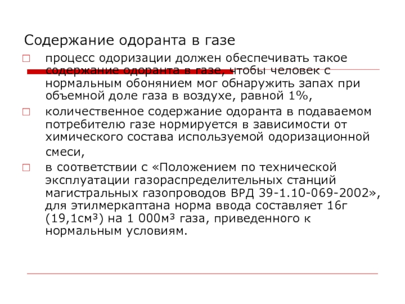 количественное содержание одоранта в подаваемом потребителю газе нормируется в зависимости от химического состава используемой одоризационной смеси,