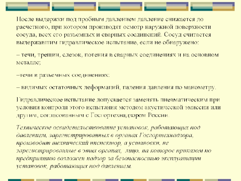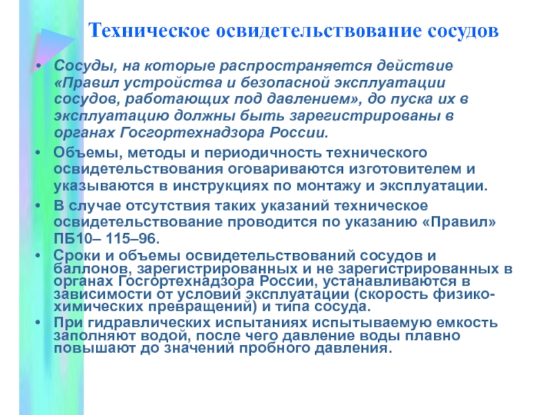 В случае отсутствия таких указаний техническое освидетельствование проводится по указанию «Правил» ПБ10– 115–96.