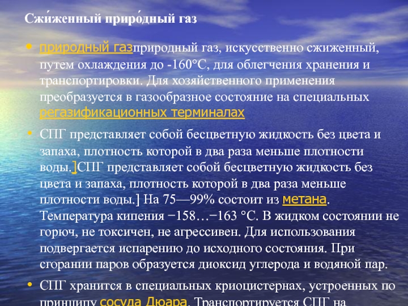 СПГ представляет собой бесцветную жидкость без цвета и запаха, плотность которой в два раза меньше плотности воды.]СПГ представляет собой бесцветную жидкость без цвета и запаха, плотность которой в два раза меньше плотности воды.] На 75—99% состоит из метана. Температура кипения −158…−163 °C. В жидком состоянии не горюч, не токсичен, не агрессивен. Для использования подвергается испарению до исходного состояния. При сгорании паров образуется диоксид углерода и водяной пар.