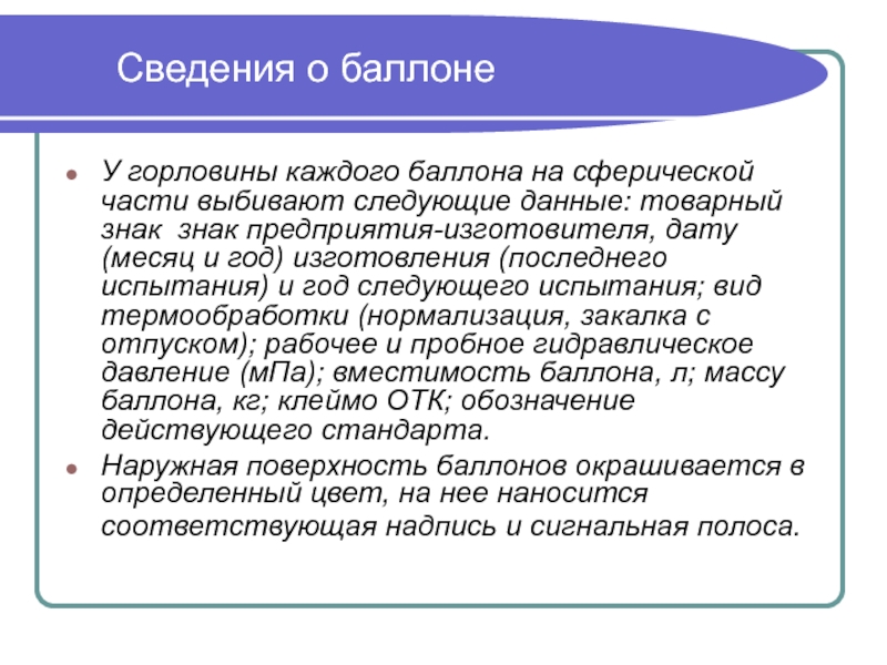 Наружная поверхность баллонов окрашивается в определенный цвет, на нее наносится соответствующая надпись и сигнальная полоса.