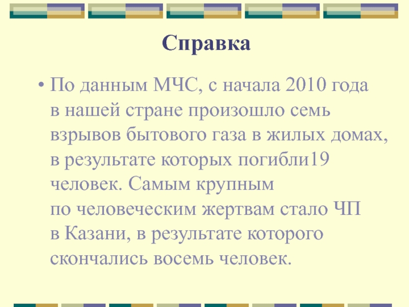 бытового газа в жилых домах, в результате которых погибли19 человек. Самым крупным по человеческим жертвам стало ЧП в Казани, в результате которого скончались восемь человек.