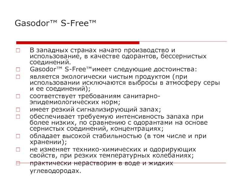 В зарубежных странах в качестве одорантов широко используются меркаптаны, получаемые в результате химического синтеза на основе серы, сероводорода, сульфидов и других сернистых соединений.