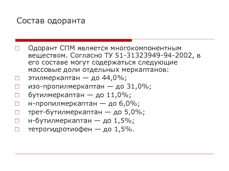 Одорант СПМ является многокомпонентным веществом. Согласно ТУ 51-31323949-94-2002, в его
