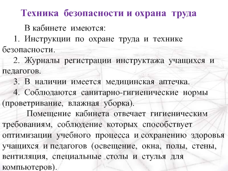 Помещение кабинета отвечает гигиеническим требованиям, соблюдение которых способствует оптимизации учебного процесса и сохранению здоровья учащихся и педагогов (освещение, окна, полы, стены, вентиляция, специальные столы и стулья для компьютеров).