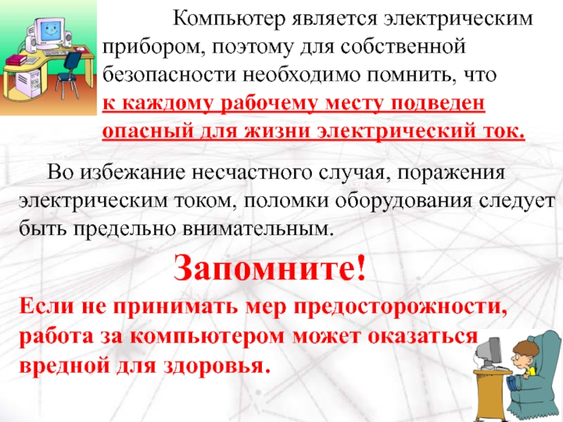 Слайд 20 Компьютер является электрическим прибором, поэтому