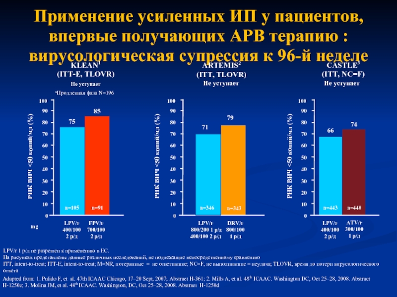 Adapted from: 1. Pulido F, et al. 47th ICAAC Chicago, 17–20 Sept, 2007; Abstract H-361; 2. Mills A, et al. 48th ICAAC. Washington DC, Oct 25–28, 2008. Abstract H-1250c; 3. Molina JM, et al. 48th ICAAC. Washington, DC, Oct 25–28, 2008. Abstract H-1250d