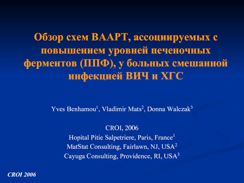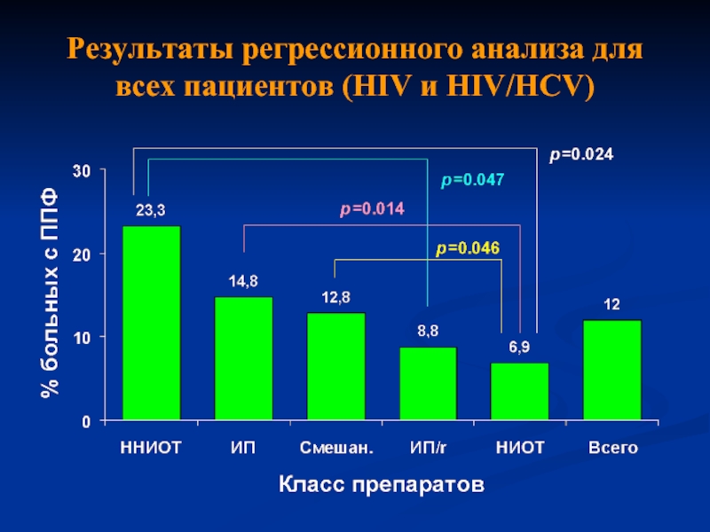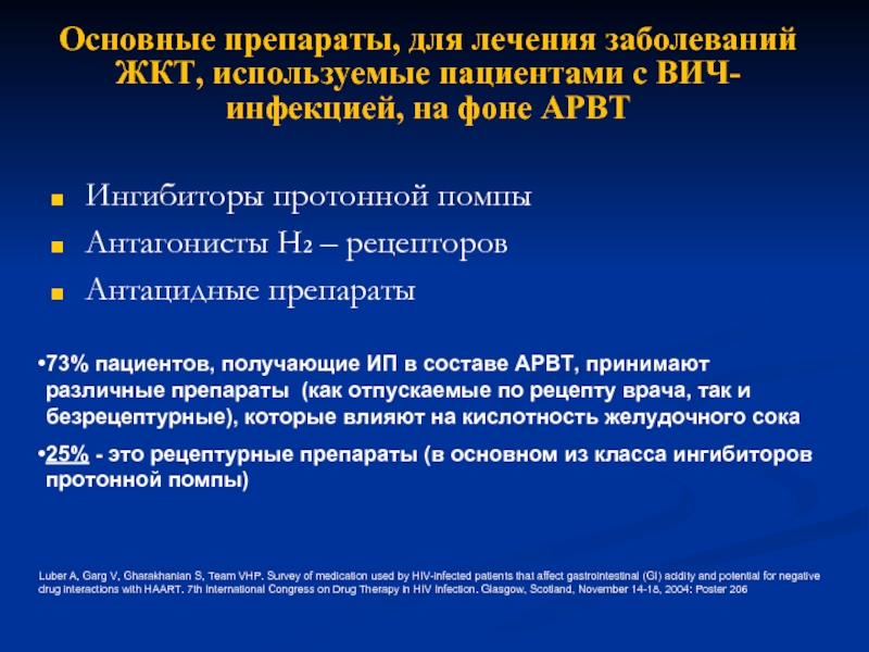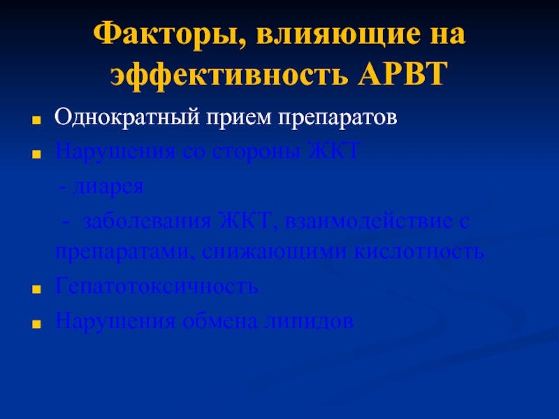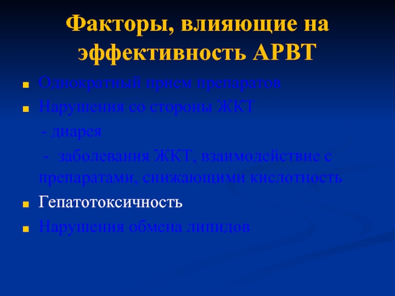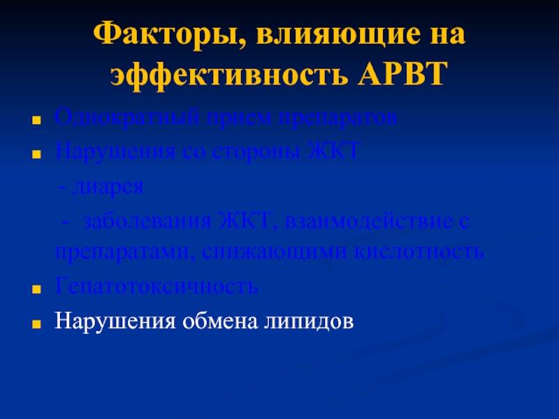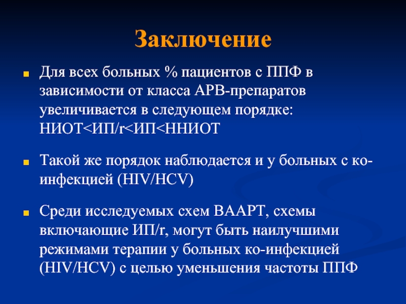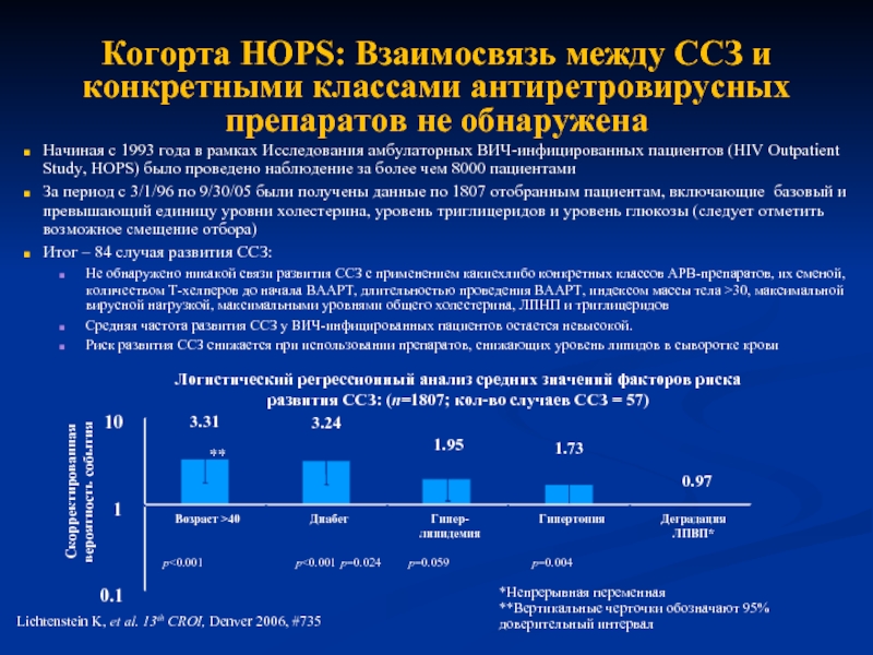 Не обнаружено никакой связи развития ССЗ с применением какиехлибо конкретных классов АРВ-препаратов, их сменой, количеством Т-хелперов до начала ВААРТ, длительностью проведения ВААРТ, индексом массы тела >30, максимальной вирусной нагрузкой, максимальными уровнями общего холестерина, ЛПНП и триглицеридов