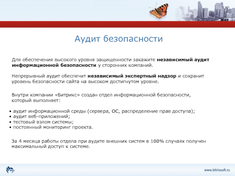 Внутри компании «Битрикс» создан отдел информационной безопасности, который выполняет: