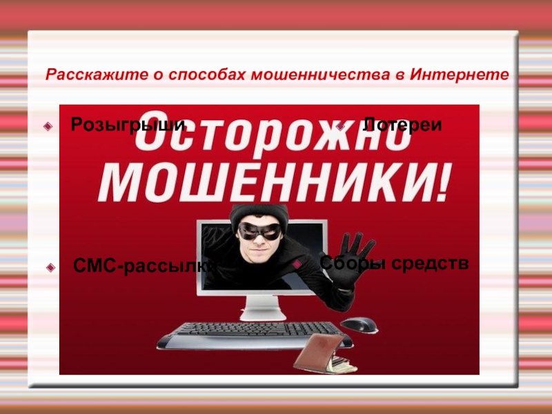 Слайд 7Расскажите о способах мошенничества в Интернете