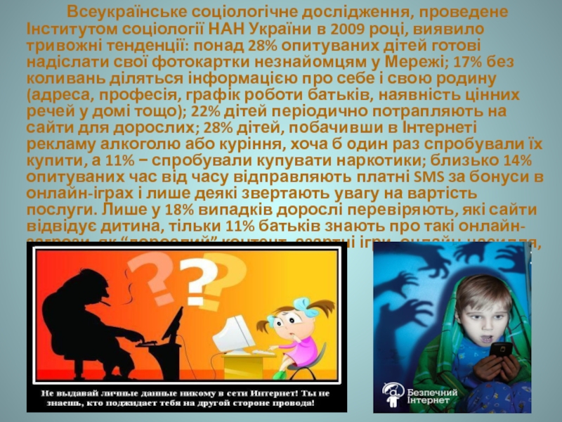 проведене Інститутом соціології НАН України в 2009 році, виявило тривожні тенденції: понад 28% опитуваних дітей готові надіслати свої фотокартки незнайомцям у Мережі; 17% без коливань діляться інформацією про себе і свою родину (адреса, професія, графік роботи батьків, наявність цінних речей у домі тощо); 22% дітей періодично потрапляють на сайти для дорослих; 28% дітей, побачивши в Інтернеті рекламу алкоголю або куріння, хоча б один раз спробували їх купити, а 11% − спробували купувати наркотики; близько 14% опитуваних час від часу відправляють платні SMS за бонуси в онлайн-іграх і лише деякі звертають увагу на вартість послуги. Лише у 18% випадків дорослі перевіряють, які сайти відвідує дитина, тільки 11% батьків знають про такі онлайн-загрози, як “дорослий” контент, азартні ігри, онлайн-насилля, кіберзлочинність