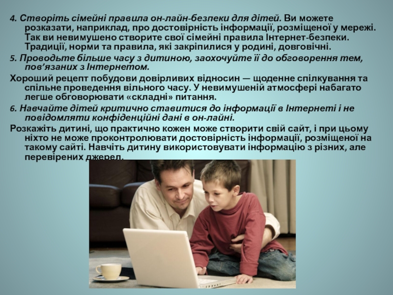 Слайд 74. Створіть сімейні правила он-лайн-безпеки для дітей. Ви можете розказати, наприклад, про
