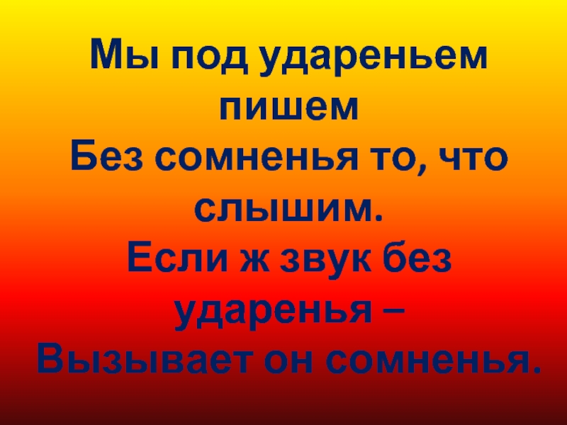 Слайд 4Мы под удареньем пишем Без сомненья то, что слышим. Если ж звук без
