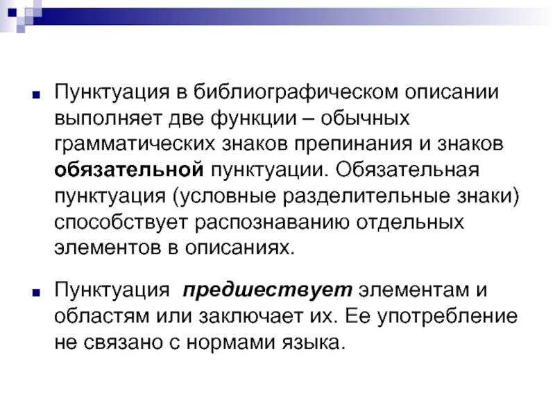 Пунктуация в библиографическом описании выполняет две функции – обычных грамматических знаков