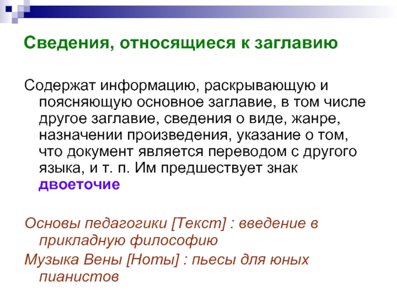 том числе другое заглавие, сведения о виде, жанре, назначении произведения, указание о том, что документ является переводом с другого языка, и т. п. Им предшествует знак двоеточие