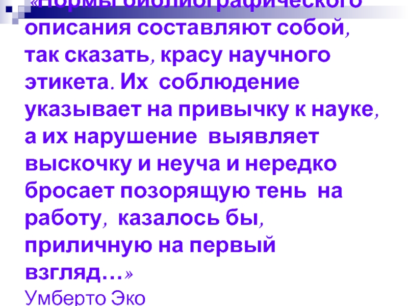 Их соблюдение указывает на привычку к науке, а их нарушение выявляет выскочку и неуча и нередко бросает позорящую тень на работу, казалось бы, приличную на первый взгляд…» Умберто Эко