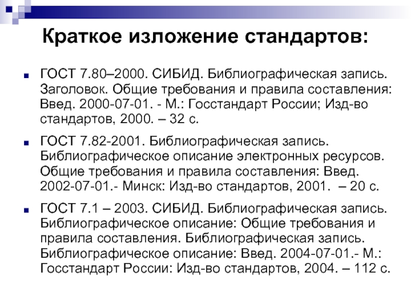 ГОСТ 7.1 – 2003. СИБИД. Библиографическая запись. Библиографическое описание: Общие требования и правила составления. Библиографическая запись. Библиографическое описание: Введ. 2004-07-01.- М.: Госстандарт России: Изд-во стандартов, 2004. – 112 с.
