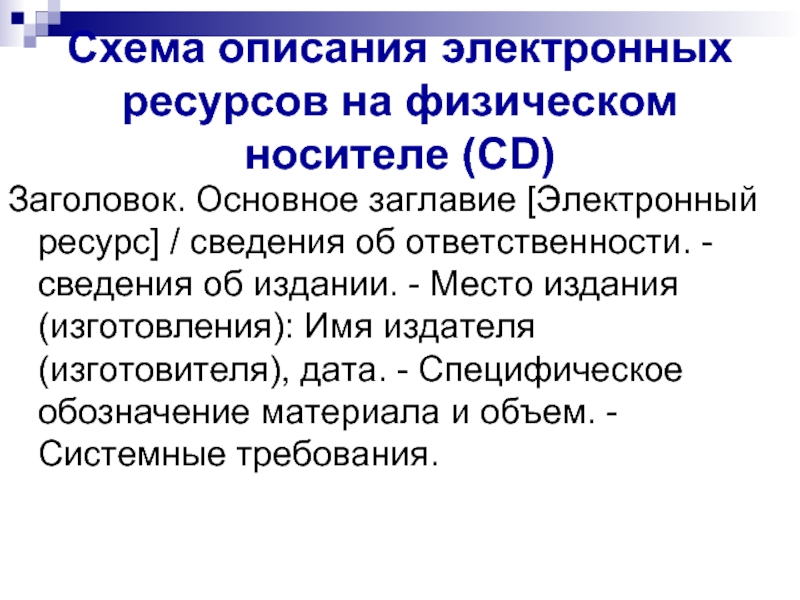 Слайд 31Схема описания электронных ресурсов на физическом носителе (CD)