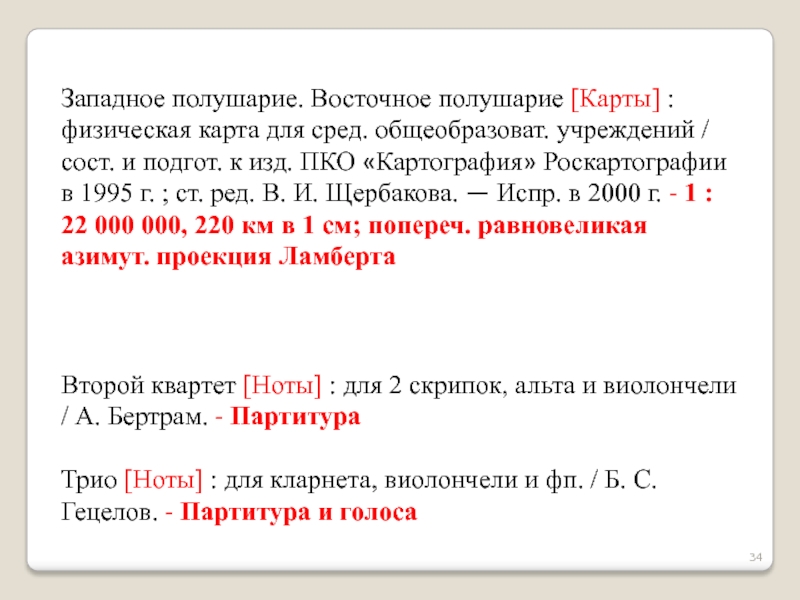 заглавию / Первые сведения об ответственности; последующие сведения об ответственности. - Сведения об издании. - Специфические сведения о документе. - Место издания, распространения : Издатель, Дата издания. - Специфическое обозначение материала и объем. - (Область серии). - Область примечания. - ISBN.