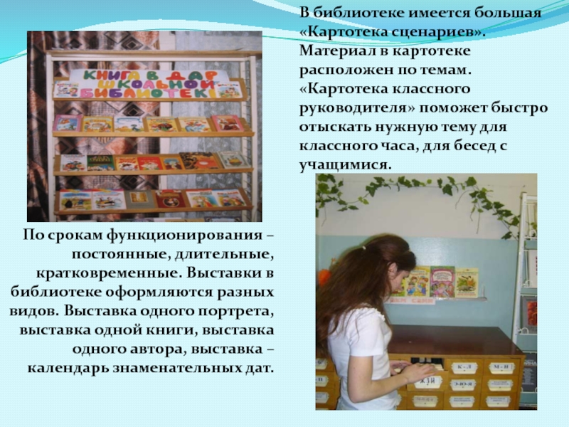 В библиотеке имеется большая «Картотека сценариев».Материал в картотеке расположен по темам. «Картотека классного руководителя» поможет быстро отыскать нужную тему для классного часа, для бесед с учащимися.