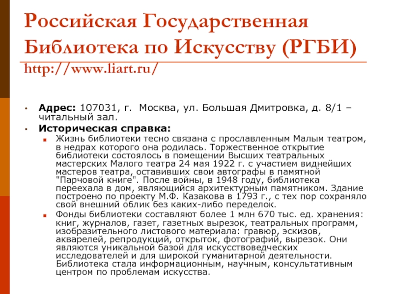 Слайд 31Российская Государственная Библиотека по Искусству (РГБИ) http://www.liart.ru/
