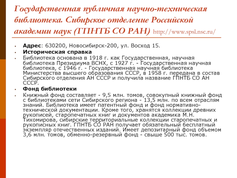 Слайд 37Государственная публичная научно-техническая библиотека. Сибирское отделение Российской академии наук (ГПНТБ СО
