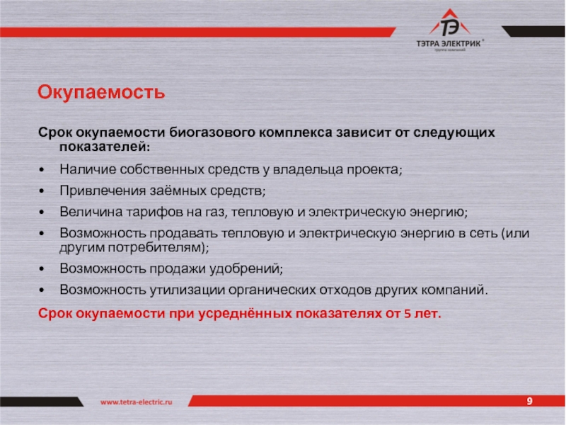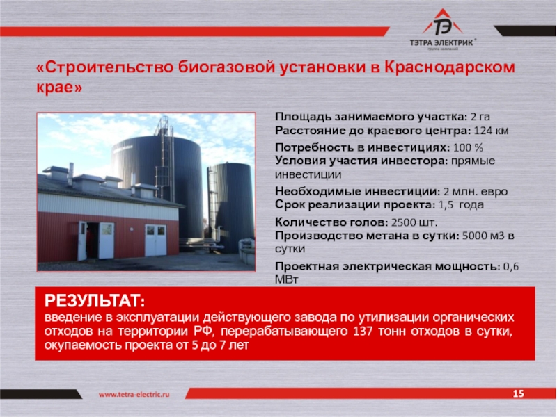 введение в эксплуатации действующего завода по утилизации органических отходов на территории РФ, перерабатывающего 137 тонн отходов в сутки, окупаемость проекта от 5 до 7 лет