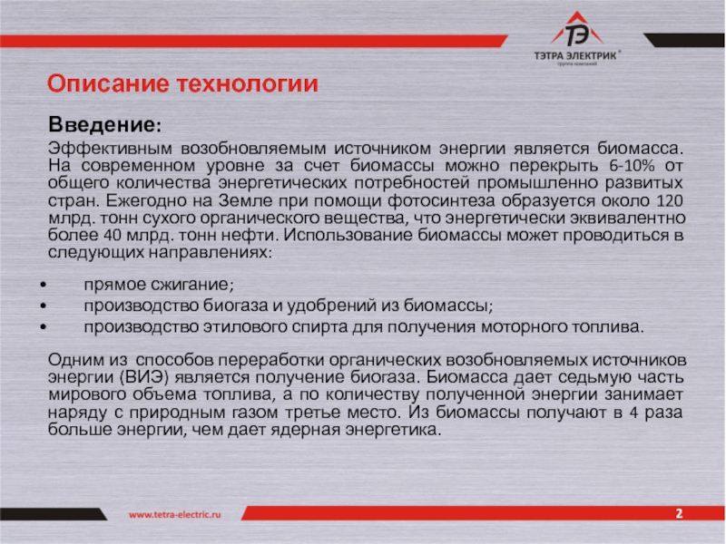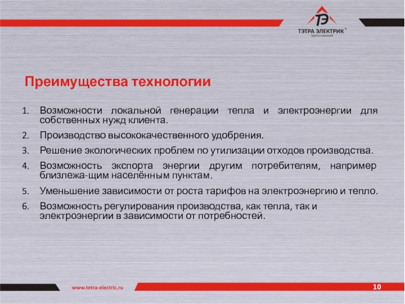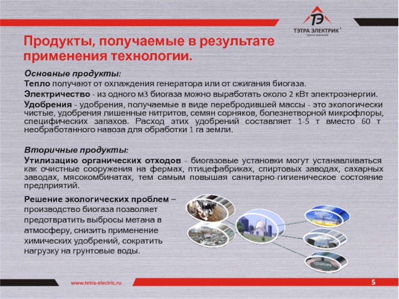 Утилизация органических отходов, производство высококачественного удобрения, попутное производство тепла и электроэнергии.