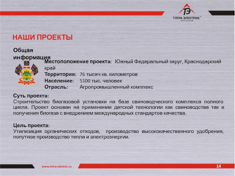 Строительство биогазовой установки на базе свиноводческого комплекса полного цикла. Проект основан на применении датской технологии как свиноводства так и получения биогаза с внедрением международных стандартов качества.