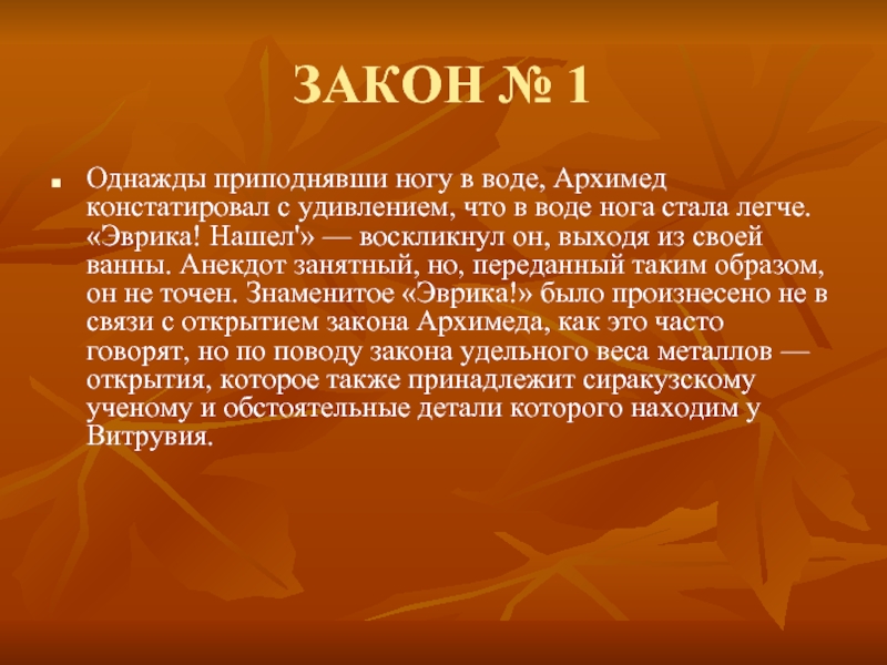 что в воде нога стала легче. «Эврика! Нашел'» — воскликнул он, выходя из своей ванны. Анекдот занятный, но, переданный таким образом, он не точен. Знаменитое «Эврика!» было произнесено не в связи с открытием закона Архимеда, как это часто говорят, но по поводу закона удельного веса металлов — открытия, которое также принадлежит сиракузскому ученому и обстоятельные детали которого находим у Витрувия.