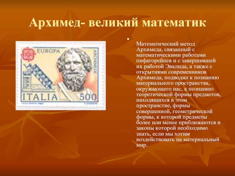 с завершившей их работой Эвклида, а также с открытиями современников Архимеда, подводил к познанию материального пространства, окружающего нас, к познанию теоретической формы предметов, находящихся в этом пространстве, формы совершенной, геометрической формы, к которой предметы более или менее приближаются и законы которой необходимо знать, если мы хотим воздействовать на материальный мир.